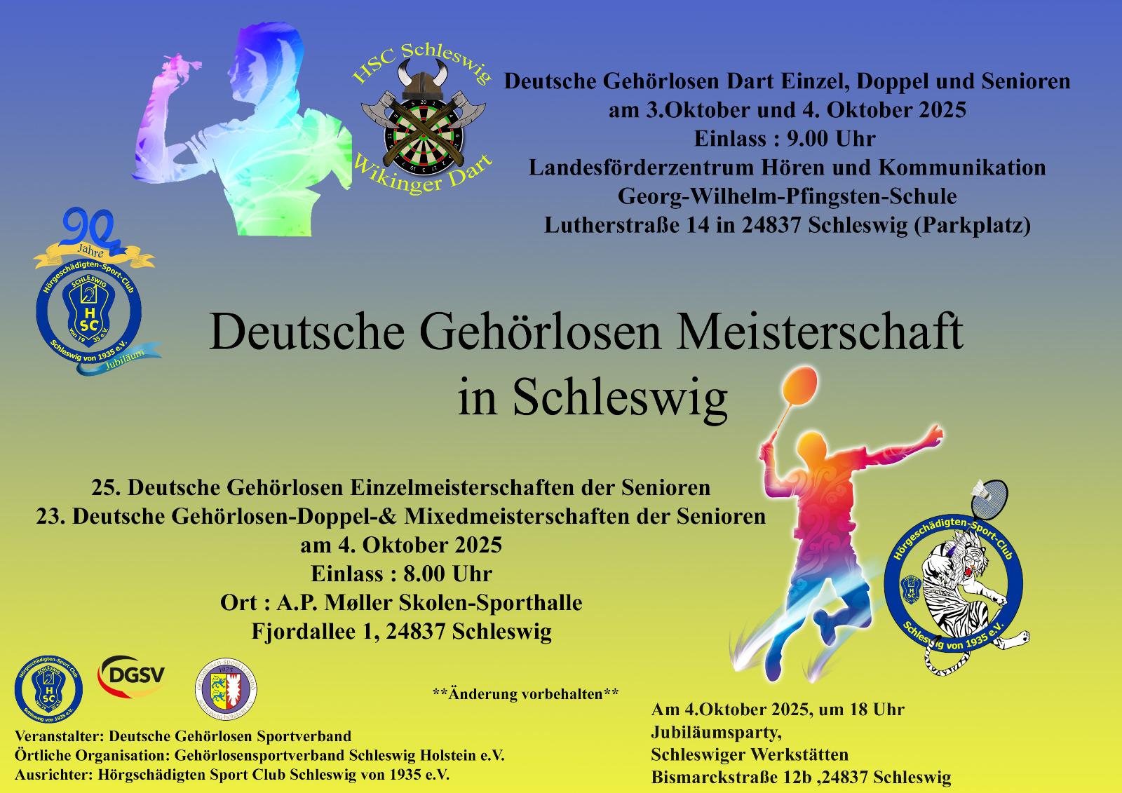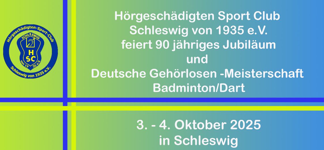 Schleswig, 4. Oktober – Anlässlich des 90-jährigen Jubiläums des HSC fanden in der Sporthalle der A. P. Møller Skolen die 25. Deutschen Gehörlosen-Einzelmeisterschaften im Badminton statt. Neben den Einzelwettbewerben der Seniorinnen und Senioren wurden auch die Doppel- und Mixed-Turniere ausgetragen.