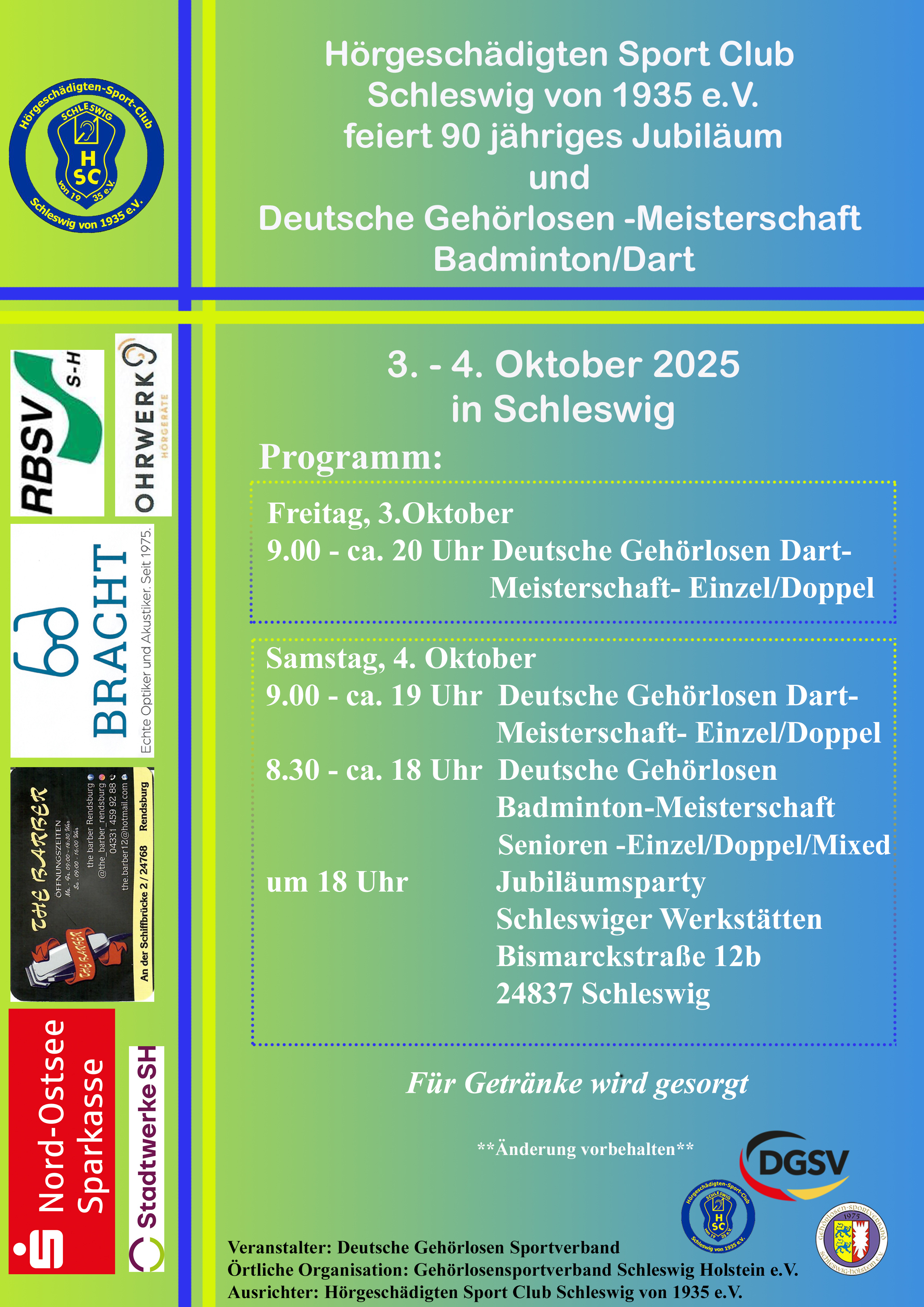 Schleswig, 3. und 4. Oktober – Zum 90-jährigen Jubiläum des HSC richtete der Verein in der Sporthalle der Georg-Wilhelm-Pfingsten-Schule die Deutschen Gehörlosen Meisterschaften im Dart aus. Insgesamt 97 Dartspielerinnen und -spieler aus ganz Deutschland traten in den Disziplinen Einzel und Doppel der Herren, Damen sowie Senioren und Seniorinnen an.